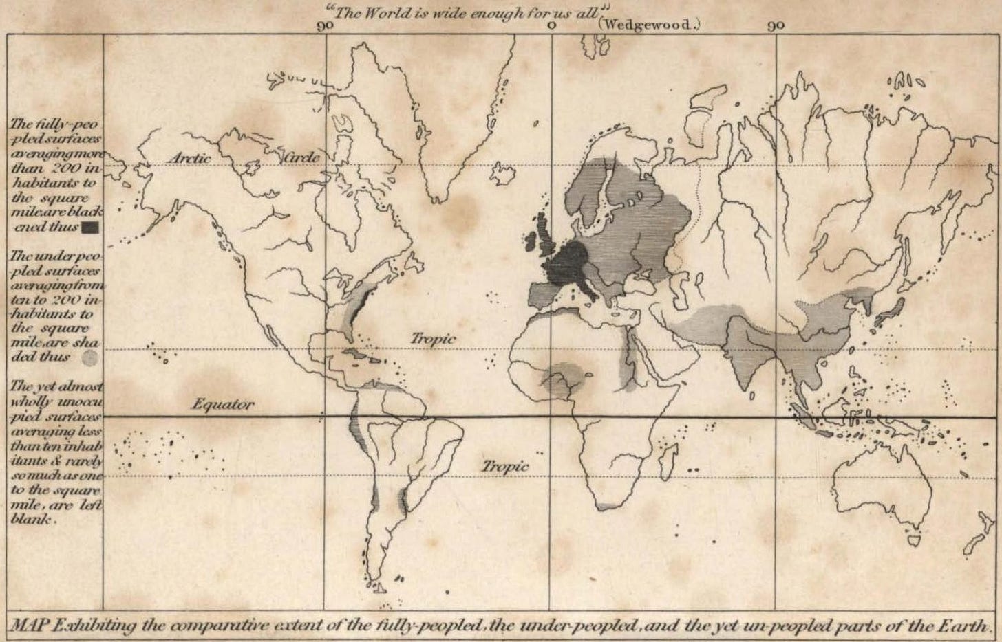 The first population density maps appeared in the 19th century, being George Julius Poulett Scrope a pioneer with this world population density map in 1833.