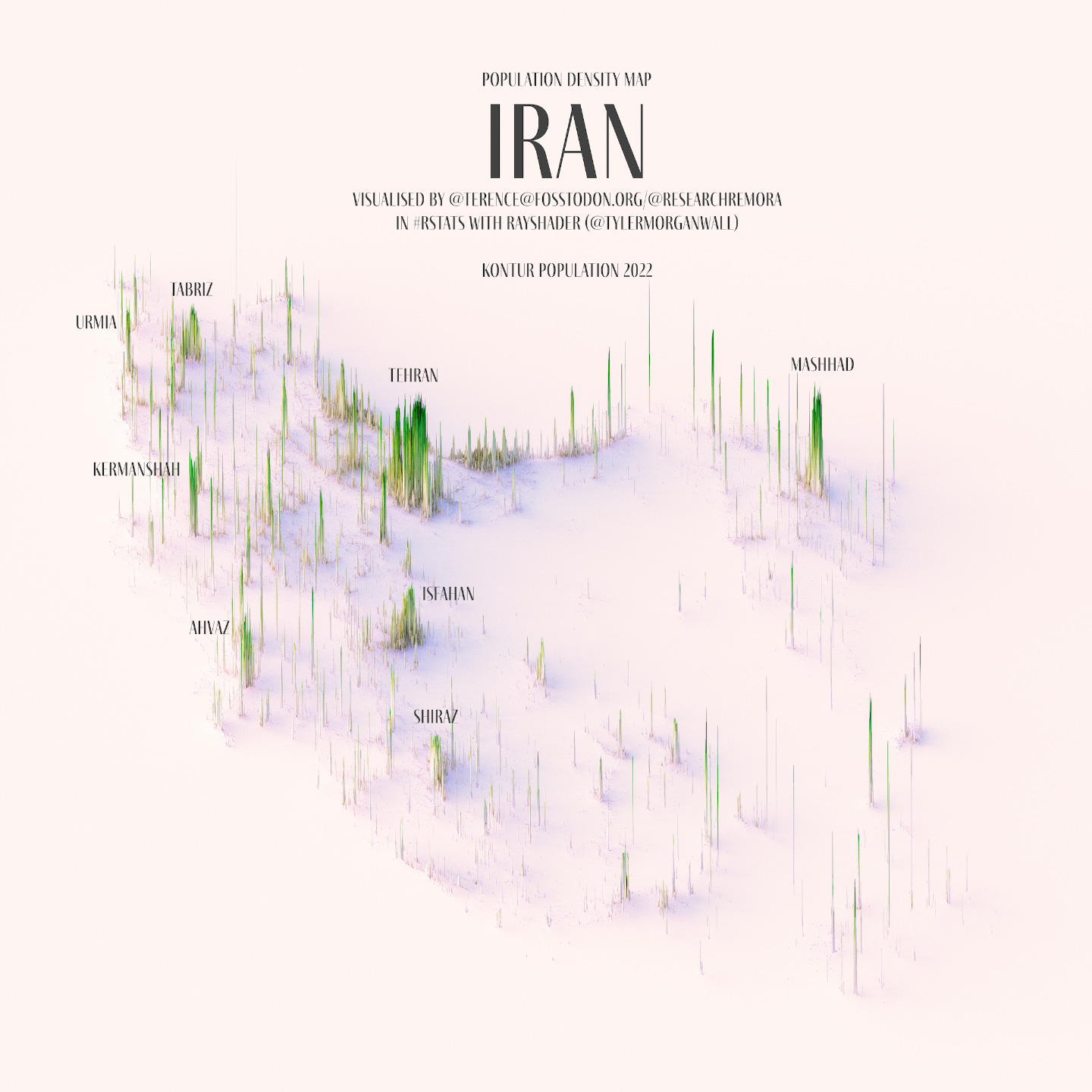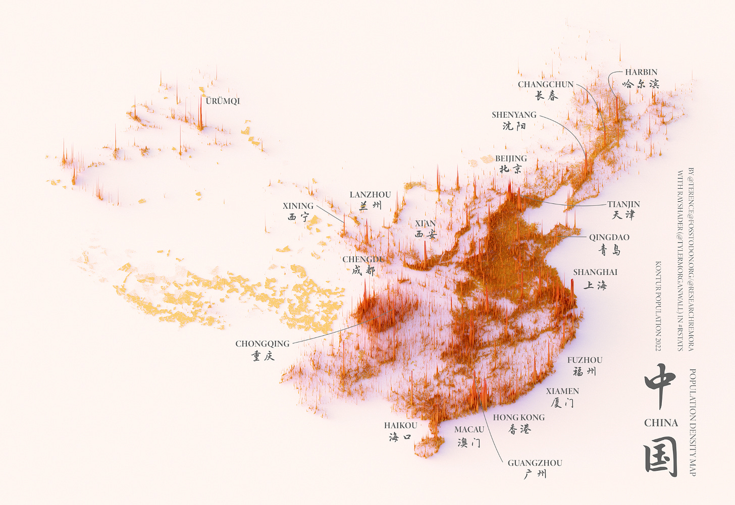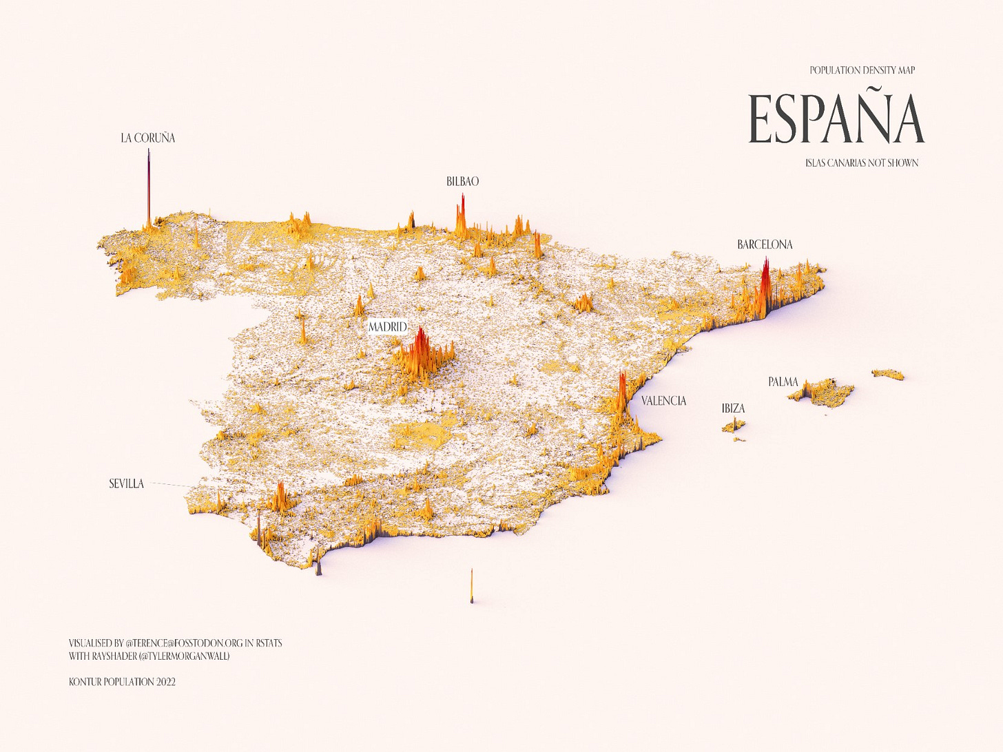 Along the same lines as Alasdair Rae’s work, we find the maps of Terence Teo. At the end of 2022, he began working on various population density maps using data provided by Kontur Population. Using R programming and the Rayshader package, he began to construct column maps of different countries around the world and published them on his various social media accounts. The first was this fabulous map of Taiwan.