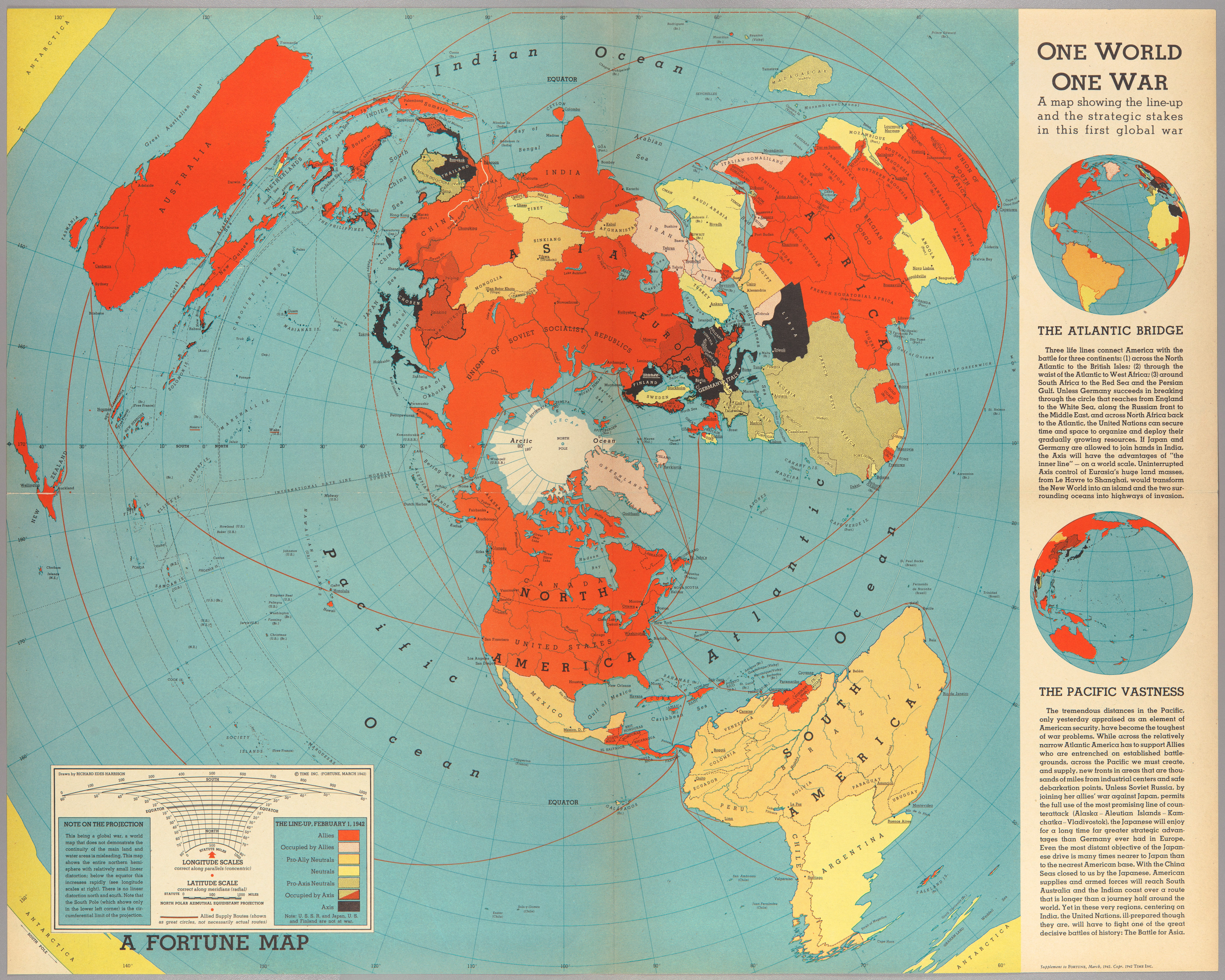 The intention was clear: the world was at war, and friendly countries were suffering defeats in Europe and Asia. American citizens, to whom the atlas was addressed, had to be made aware that inaction would ultimately have consequences. And those consequences were made tangible and detailed once again on a map.