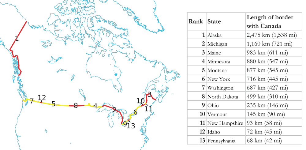 If it is just a straight line, as is the case for much of the border between the United States and Canada, there should not be any problem. But if the border is defined by a river, then we may again encounter the same difficulty as with the coast of Great Britain4. Ignoring this fact, we have two possible answers to the question of which is the longest border.