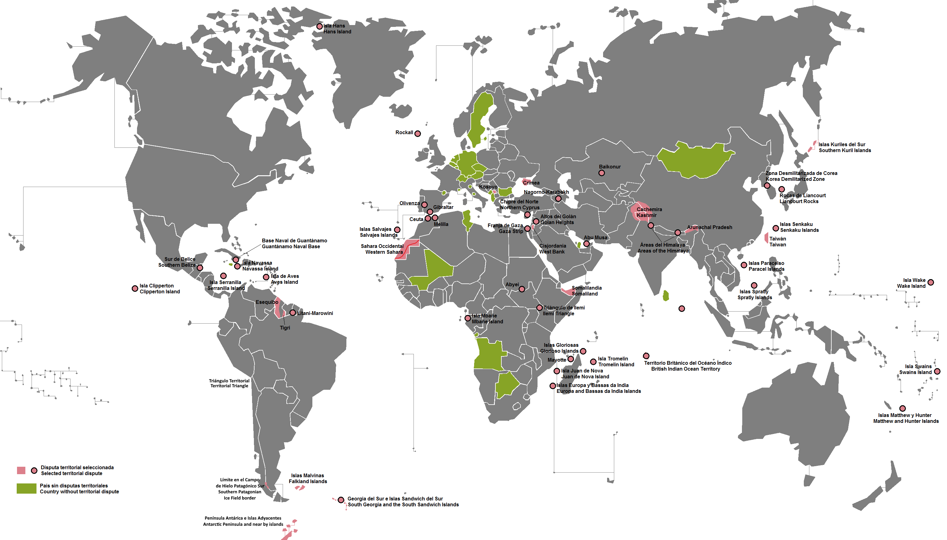 As if that weren’t enough, there are countless territorial conflicts, which make it impossible to define a definitive list of borders agreed upon by all the nations of the world. Some disputes are many years old and are merely symbolic, as in the case of Olivenza, but there are other much more complicated cases, such as China’s claims in Bhutan. Here is another map to give you an idea. In green are the countries that have absolutely no territorial disputes.