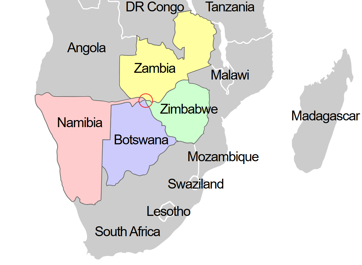 If we stick to the two countries that share a total border with the shortest distance, we find the answer thanks to European colonialism in Africa. The process of decolonization gave rise to the only point where the borders of four countries coincide: Zambia, Zimbabwe, Namibia, and Botswana. And yes, it has a name: it is called an international quadripoint.